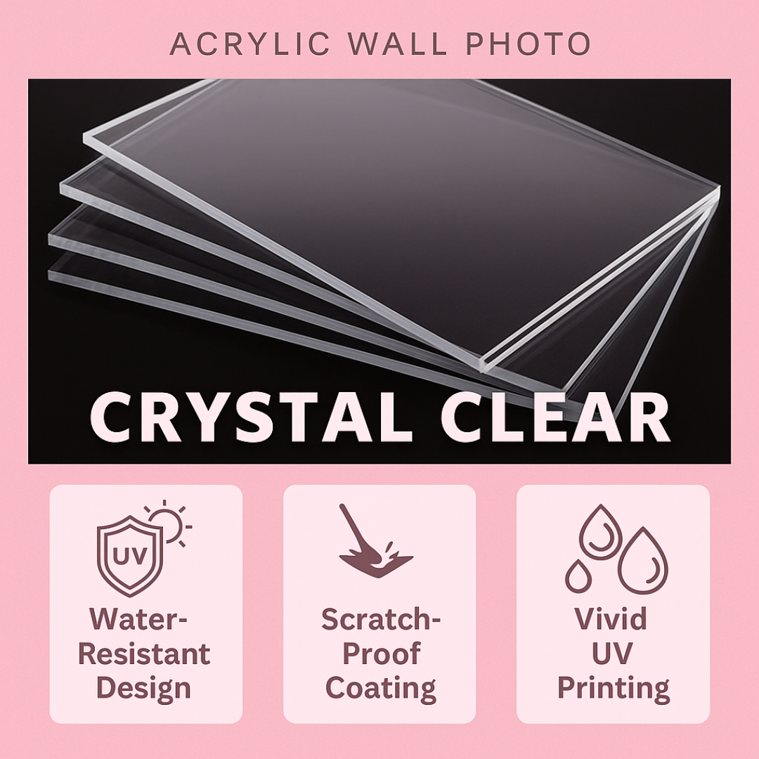 We use unidirectional, pixel-perfect printing on crystal-clear acrylic sheets. Each photo is printed with Ultra HD DPI resolution for vibrant, high-definition quality.