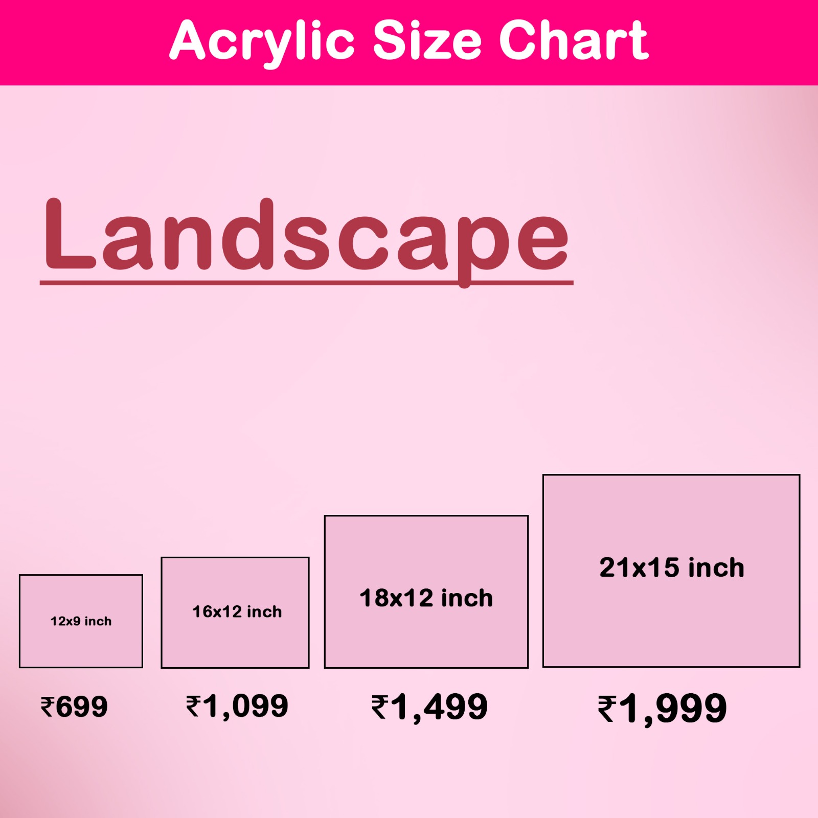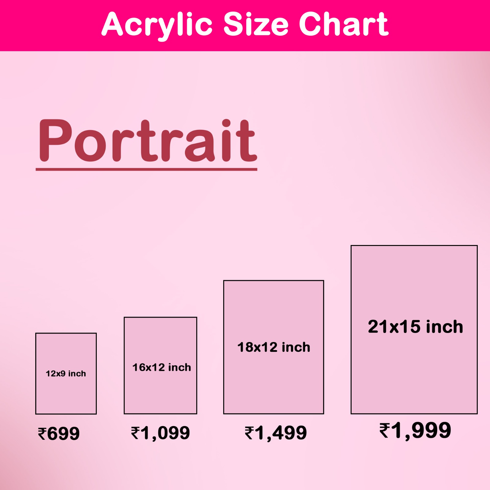 Pick the perfect acrylic frame size (12x9, 16x12, 18x12, etc.) and thickness (5mm or 8mm).